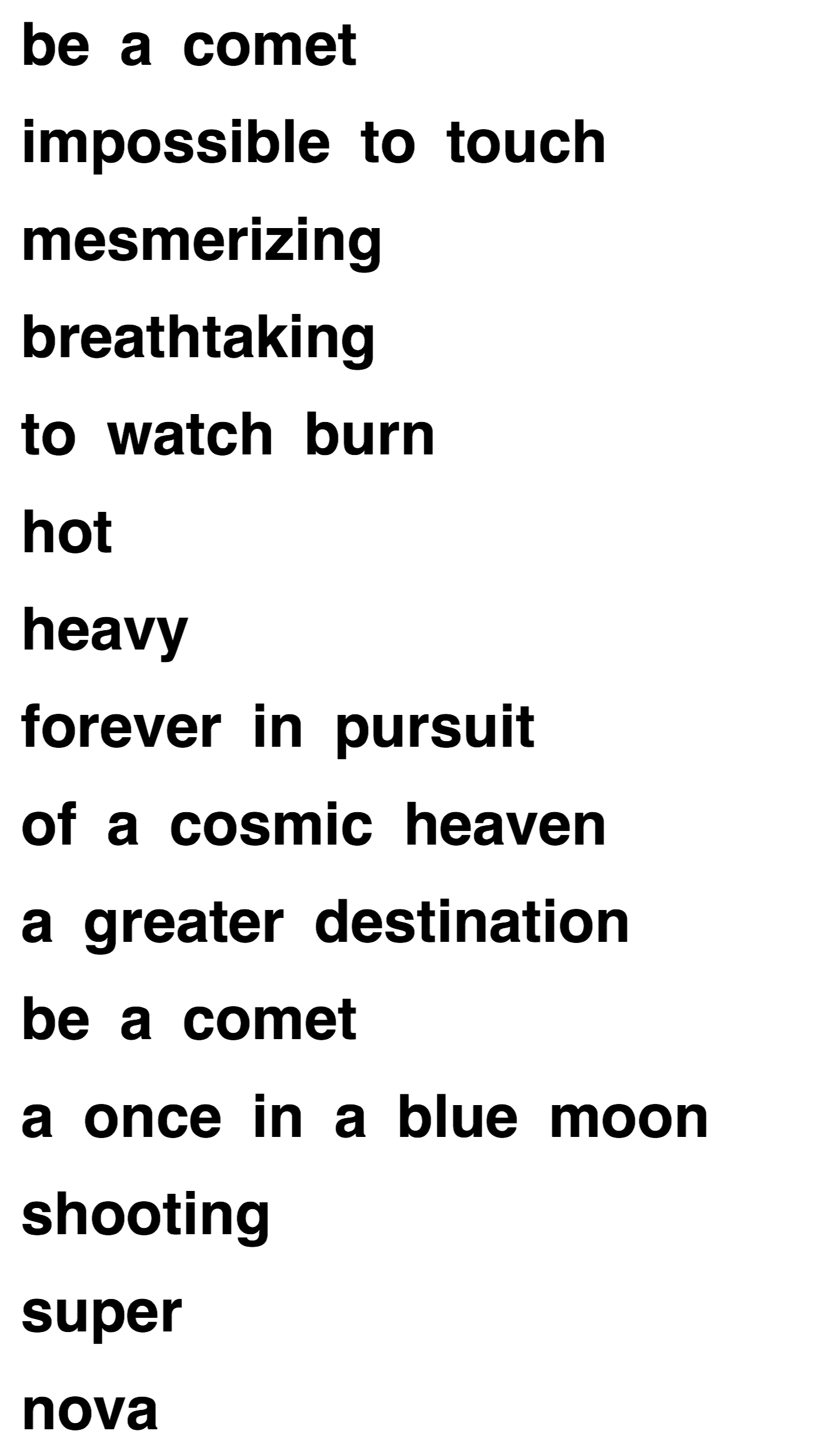 You are so unbelievably bright. Blinding, magnetic, glitter, tears, first kisses on the dance floor, once in a lifetime. You do not come around often, you are a reunion after weeks of passed time, ever expanding, a forever student of the universe, and I love watching you. Put goodness into the world, see goodness, accept everyone and love everything. Do not stop moving and burn for all eternity. Be a comet. Be a comet. Be a comet.