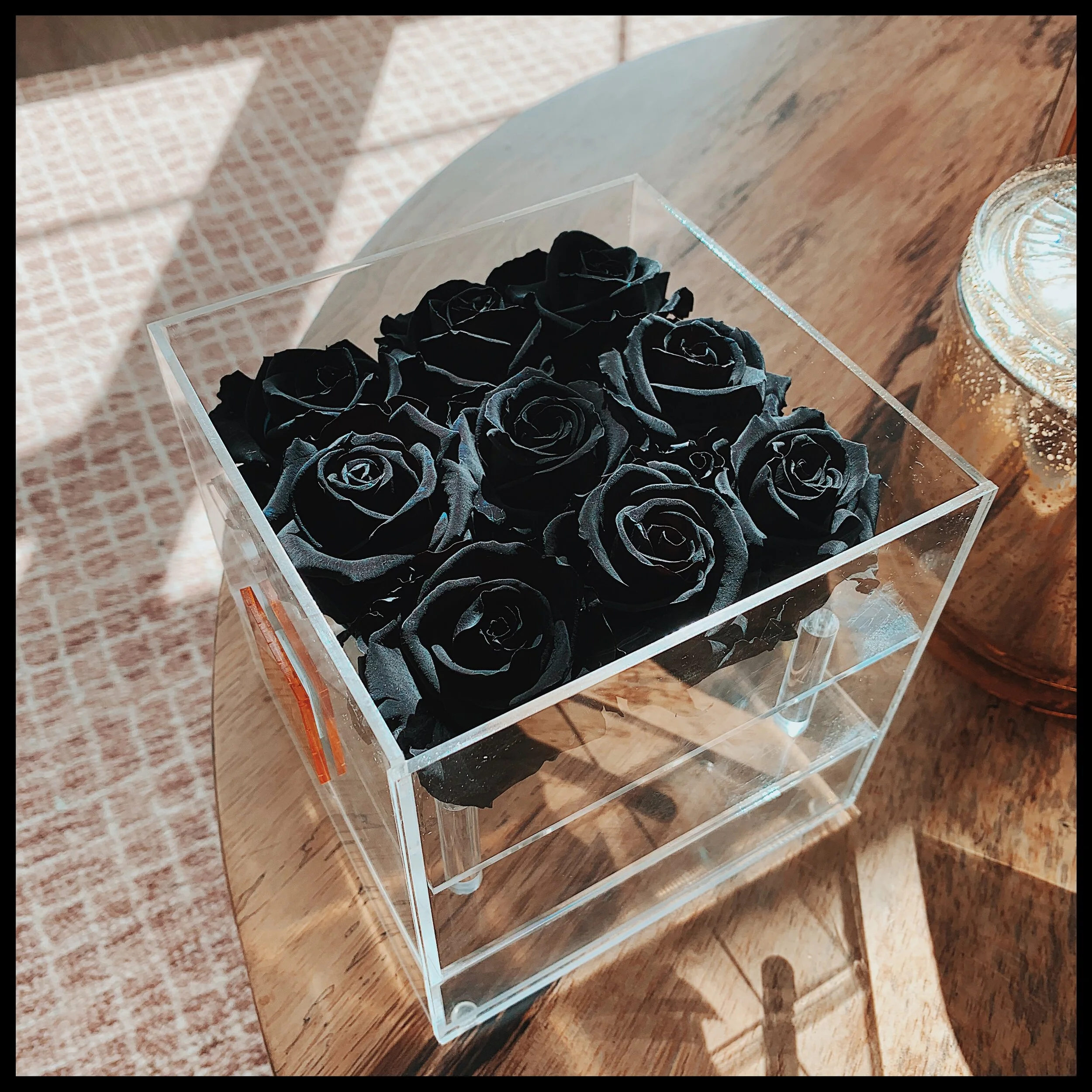 Each box contains real preserved roses that last forever with no water needed. Each rose is unique and beautiful in their own way. The roses sit in a gorgeous, lucite acrylic box. The boxes come in all shapes and sizes. The box without a drawer can be used as a centerpiece on a coffee table or styled on a shelf. The box with a drawer can be used to store business cards, skincare, makeup, candy, and more.